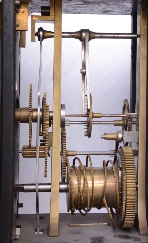 the clock retains its original finish including front glass with gold leafed "REGULATOR" on door. The bottom is absent. The top finial is missing its tip. The door has its hinges reversed. Pendulum marked Fremeau [this is the clock referred to in the dedication story about John Fletcher]