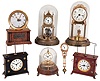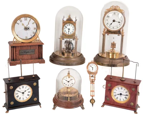 Clocks- 7 (Seven) German: three are Horolovar reproductions, two anniversary 400-day with disk pendulums, "La Mysterieuse" by Hamburg American, and Junghans swinging arm (no figural stand): 20th century the mystery clock has a broken center glass disk, the Junghans is missing its base and crystal, and the Ignatz clocks both are missing the ball at the end of the string. None were tested, and all sold as is with no further details. Ht of tallest, with glass dome, is 12.5 in