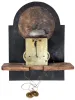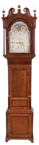 William Waite, Burslem, England, tall clock, 8 days, time and bell strike, weight driven movement in an oak case with mahogany veneer and string inlay accents with painted iron dial with moon phase, second's bit and calendar. the case has an old refinish and is in very good condition. The finials are older replacements. The dial is repainted. This is a fine looking example.