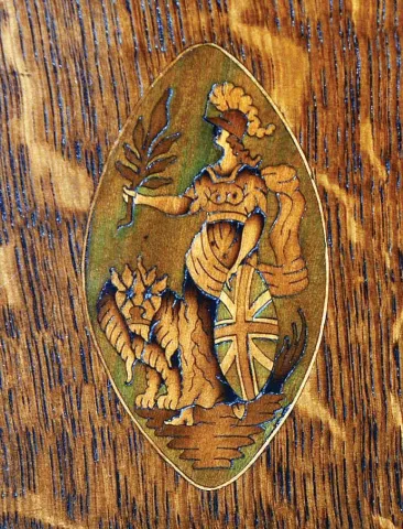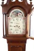 William Waite, Burslem, England, tall clock, 8 days, time and bell strike, weight driven movement in an oak case with mahogany veneer and string inlay accents with painted iron dial with moon phase, second's bit and calendar.