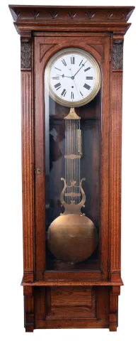 Jeweler's regulator wall clock, 8 days, time only, brass weight driven movement pinwheel escapement and compensated lyre gridiron pendulum in an oak case with beveled glass front white enamel dial