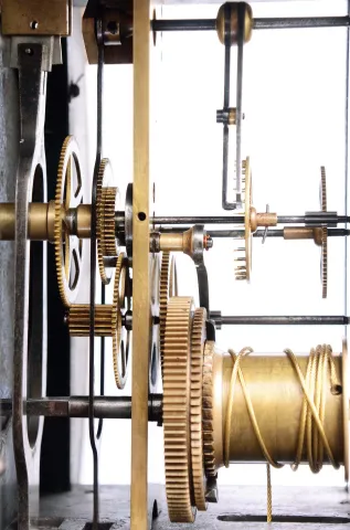 the case retains its original finish. The top is an old replacement and moldings have been rear sides of the case. Top left and right return moldings have been cut off and reapplied. The movement has been associated with this case.