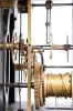 Jeweler's regulator wall clock, 8 days, time only, brass weight driven movement pinwheel escapement and compensated lyre gridiron pendulum in an oak case with beveled glass front white enamel dial the case retains its original finish. The top is an old replacement and moldings have been rear sides of the case. Top left and right return moldings have been cut off and reapplied. The movement has been associated with this case.