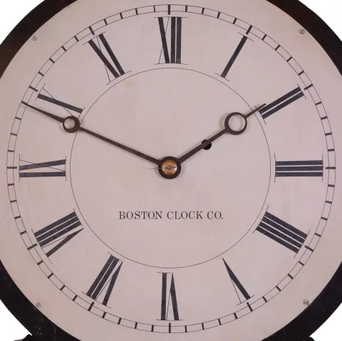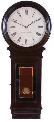 Boston Clock Co., Boston, Mass., wall hanging clock with a weight driven 8 day timepiece movement in a cherry case.