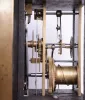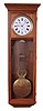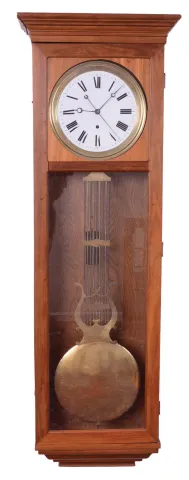 A period French-made pinwheel escapement 8 day brass weight-driven regulator timepiece movement in a contemporary bench made walnut case with gridiron lyre pendulum and brass weight.
