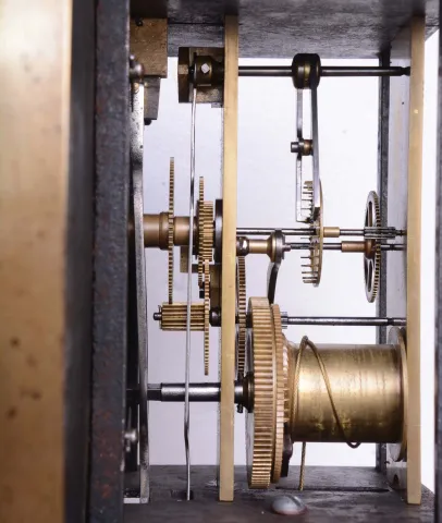 the case retains its original finish with loose upper moldings that will need tightening. The white enamel dial and hands are original and in good condition.