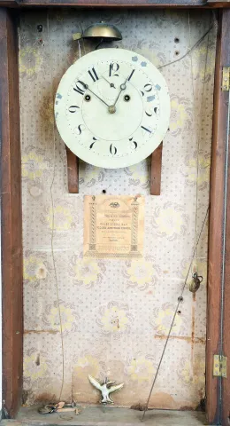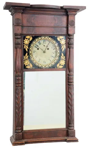 Mahogany and mahogany veneered case in very nice condition with an original alligatored finish. There is a small piece missing on the underside of the bottom molding. Original painted dial with a small loss between two and three o'clock and in a couple places on the outer edge. Hour and minute hands are original. Seconds hand is a replacement. Very nice well preserved wall paper inside the case as well as a very nice label. Original tablet with some minor restoration. Original eagle pendulum. All of the pulleys are replacements.