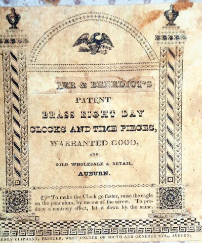Munger & Benedict, Auburn, New York, 8 days, time and strike weight brass movement Ironing Board shelf clock. Mahogany and mahogany veneered case in very nice condition with an original alligatored finish. There is a small piece missing on the underside of the bottom molding. Original painted dial with a small loss between two and three o'clock and in a couple places on the outer edge. Hour and minute hands are original. Seconds hand is a replacement. Very nice well preserved wall paper inside the case as well as a very nice label. Original tablet with some minor restoration. Original eagle pendulum. All of the pulleys are replacements.