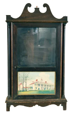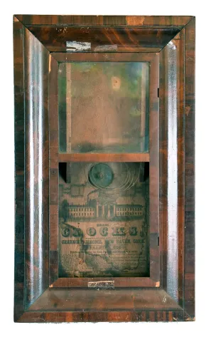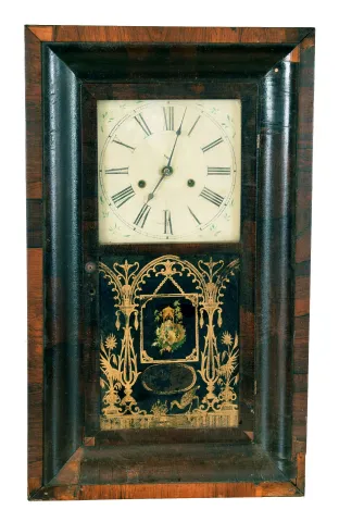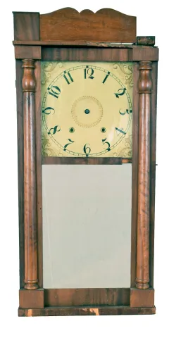 Clocks- 6 (Six): (1) Chauncey Jerome, New Haven, Conn. OG case only, c. 1850. (2) Gilbert pillar & scroll, case only, c. 1915. (3) Chauncey Jerome, Bristol, Conn, OG case only, c. 1840; (4) Unmarked half column and splat transition clock with a weight driven 30 hour time and strike movement in a mahogany case. (5) Southern Clock Co., Andersonville, SC, OG shelf clock with a spring driven 30 hour time and strike movement in a rosewood veneered case. (6) Riley Whiting, Winchester, Conn. carved half column and splat transition clock with a weight driven 30 hour time and strike movement in a mahogany case. (1) Veneer damage, lower glass missing, no movement, dial, hands, pendulum or weights; (2) No movement, dial, hands, pendulum or finials; (3) Veneer damage, no movement, dial, hands, pendulum or weights. (4) The case has veneer issue and damage to the top. The dial has been restored. There are no hands, pendulum bobs or weights. The door mirror and top glass are period. (5) The veneer has many damaged areas. The dial and hands are in fair condition. There are no weights or pendulum bob. (6) The dial has been redrilled and plugged. There are no hands, weights or pendulum bob.