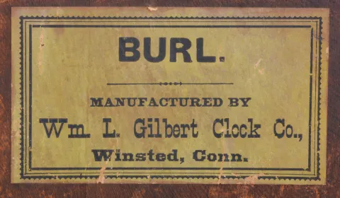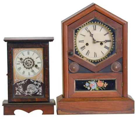 Clocks- 2 (Two): (1) William L. Gilbert Clock Co., Winsted, Conn., "Burl", 30 hour, time and alarm spring brass movement cottage clock, c1881 (2) New Haven Clock Co., New Haven, Conn., 30 hour, time and strike spring brass movement cottage clock, c1875