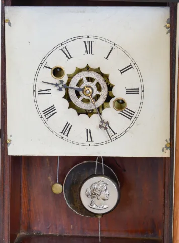 Clocks- 2 (Two): (1) William L. Gilbert Clock Co., Winsted, Conn., "Burl", 30 hour, time and alarm spring brass movement cottage clock, c1881 (2) New Haven Clock Co., New Haven, Conn., 30 hour, time and strike spring brass movement cottage clock, c1875 (1) Softwood case with a grain painted door in an old finish. Original painted dial has minor loss at the mounting screws. Original tablet, pendulum and hands. Clean label on the back. (2) Walnut veneered case has remains of old finish and some veneer loss on the base. Original glasses and hands. Dial looks to have been repainted.