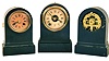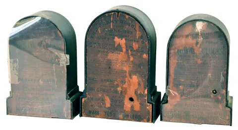 These came in plain black or with various paint decorated cases, but these all appear to have been undecorated. (1) The paper dial is period and may be original, but has a large center hole, so may have originally been from an alarm model. The hands are not original. Ht. 9in; (2) The hands and paper dial are orginal. The dial glass bezel is loose and needs to be resoldered.Ht. 8.25in; (3) The dial, hands and bezel are missing. Ht. 8.25in; All have partial of original labels.
