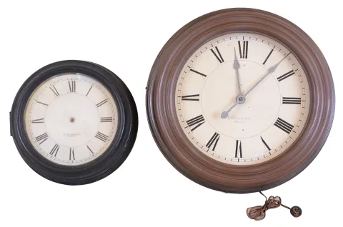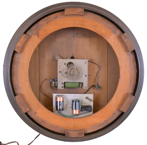Clocks- 2 (Two) E Howard & Co., Boston, electric clocks: the first with 24 1/2 inch metal case, Roman numeral painted dial, signed nickel plated movement, the other a case only, 17 inch turned wooden case, and Roman numeral painted dial larger clock working, with a pair of unfinished reproduction hands, bezel replaced, the other without movement or backboard