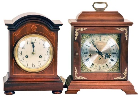Clocks- 2 (Two): (1) Hamilton Clock Co., 8 day, time and strike Westminster chime spring brass movement bracket clock, c1978 (2) Germany, Junghans, 8 day, time and strike spring brass movement mantel clock, c. 1915. (1) Mahogany case in original finish. Brass and silvered chapter ring in nice clean condition. Original hands. Hermle balance wheel brass movement. Ht 15.5" (2) Inlayed mahogany case in original finish. Original silvered dial has some tarnish and surface scratches at the winding arbors. Original hands. Movement is signed. Ht 13.25"
