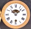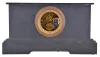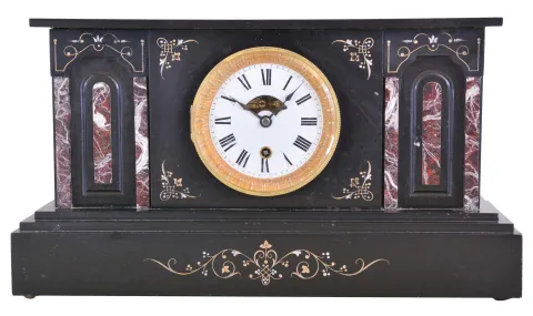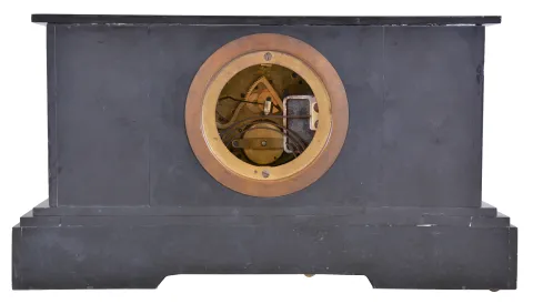 Black marble case with contrasting inlays in nice condition has some tiny chips on the bottom edge of the base and a small chip on the underside of the top left side. Original porcelain dial and hands. Rear access door is missing. One small brass button foot is missing.