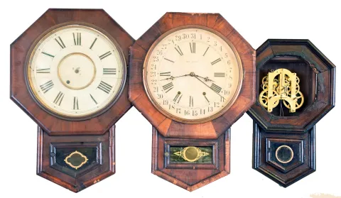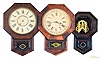 Clocks- 5 (Five): (1) New Haven Clock Co., New Haven, Conn., Short Drop wall hanging clock with a spring driven 8 day time, strike and simple calendar movement in a rosewood veneered case, c1890. (2) New Haven Clock Co., New Haven, Conn., Short Drop wall hanging clock with a spring driven 8 day timepiece movement in a mahogany veneered case, c1890, (3) New Haven Clock Co., New Haven, Conn. "Ventura" short drop wall hanging clock with a spring driven 8 day timepiece movement in a rosewood veneered case with advertising, c1890. (4) Ansonia Brass & Copper, Ansonia, Conn., Short Drop wall hanging clock with a spring driven 8 day time and strike movement in a rosewood veneered case, c1870. (5) Asian short drop wall clock with an Ansonia 8 day spring driven time and strike movement, c1890. (1) Substantial veneer issues; dial and hands appear to be original. Ht. 24in. (2) The case has veneer issues. The dial glass is cracked. The hands are absent. Ht. 24 in. (3) The case has been painted white. The clock has advertising under the white paint and on dial. Ht. 25in. (4) The case and dial have been complete blackened with soot from a fire. Ht. 26in. (5) The clock is missing dial, hands and bezel. Ht 19.5in.