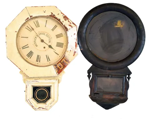 (1) Substantial veneer issues; dial and hands appear to be original. Ht. 24in. (2) The case has veneer issues. The dial glass is cracked. The hands are absent. Ht. 24 in. (3) The case has been painted white. The clock has advertising under the white paint and on dial. Ht. 25in. (4) The case and dial have been complete blackened with soot from a fire. Ht. 26in. (5) The clock is missing dial, hands and bezel. Ht 19.5in.