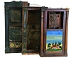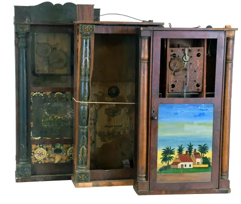 (1) The dial, hands and weights are absent. The upper glass is missing The lower glass is a replacement. This case does not have a Seth Thomas movement. Ht. 33in. (2) The movement, hands, weights, pendulum bob, splat and the case back are absent, but a dial is present. Ht. 24in. (3) The movement, dial, hands, weights, splat and pendulum bob are absent. The glass tablet is a nice replacement. Ht. 30in. (4) The movement, dial, hands, weights, pendulum bob and door glasses are absent. Ht.34.5 (5) The case has original finish, darkened with age. There are veneer issues in several areas. The dial, hands, weights and pendulum bob are absent. The glasses are all original, the top badly flaked, but bottom tablet glass still in good condition. Ht. 35in.