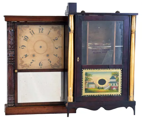 Clocks- 5 (Five): (1) Seth Thomas. Plymouth, Conn. Half Column and Splat shelf clock with a 30 hour weight driven time and strike wooden works movement, c1830. (2) Unidentified short Wooden works carved column case only, c1830. (3) Silas Hoadley, Plymouth