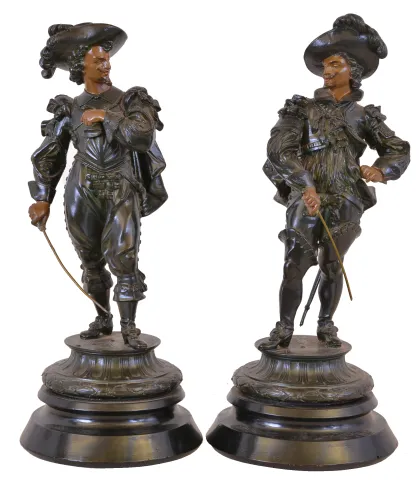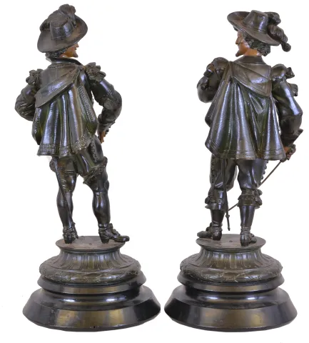 Two cast spelter figures on ebonized wooden bases, probably representing Don Caesar and Don Juan, or two of the musketeers surfaces with restoration