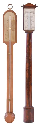 Barometers- 2 (Two) mercury: (1) 19th century period example in a crotch mahogany veneer bow front case; (2) Modern