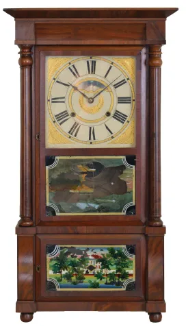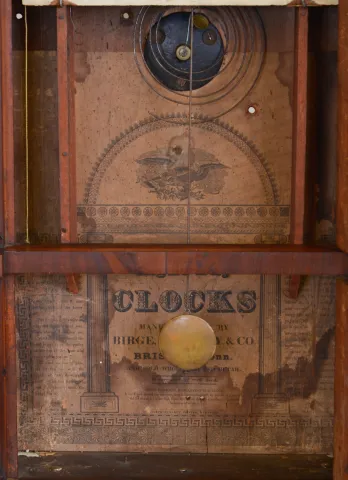 Birge, Mallory & Co., Bristol, Conn., 8 day, time and strike weight brass movement column & cornice shelf clock. Mahogany and mahogany veneered case in an old finish has a minor repair on the cornice top. Original painted dial is very nice for its age and retains its mirror insert. Original bottom tablet has scattered loss, but restorable. Center tablet needs more serious attention. Original hands. Nice label inside the case.