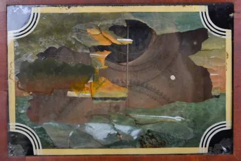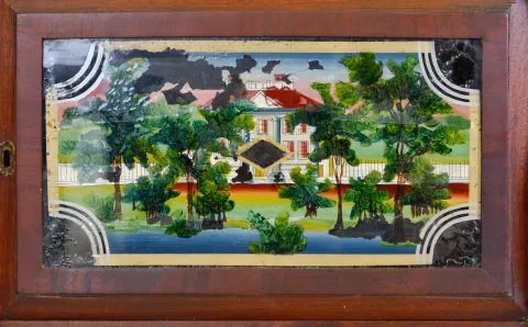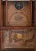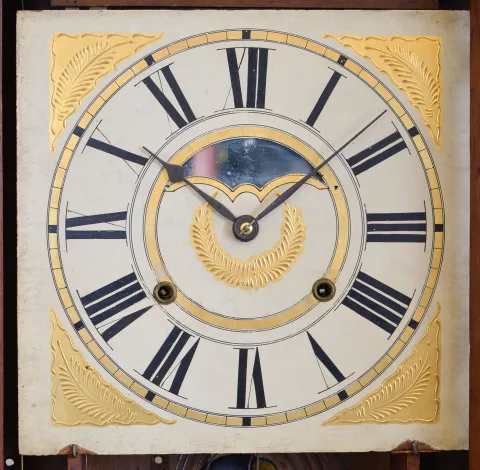 Mahogany and mahogany veneered case in an old finish has a minor repair on the cornice top. Original painted dial is very nice for its age and retains its mirror insert. Original bottom tablet has scattered loss, but restorable. Center tablet needs more serious attention. Original hands. Nice label inside the case.
