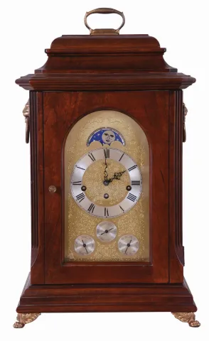 Unknown American mfg bracket clock, with Franz Hermle Westminster chime and calendar movement, and with rolling moon in the arch of the embossed dial. Case with mahogany finish, and with cast feet, handle and side lions. Day of week, date and month in