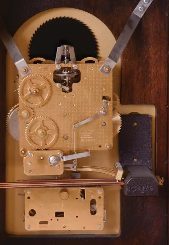 Unknown American mfg bracket clock, with Franz Hermle Westminster chime and calendar movement, and with rolling moon in the arch of the embossed dial. Case with mahogany finish, and with cast feet, handle and side lions. Day of week, date and month in English show on bottom dials. floating balance movement runs a while and stops [common on this model], dated 1981. Case retains original finish in good order. Lots of look for the money.