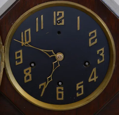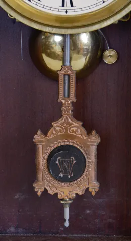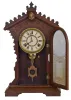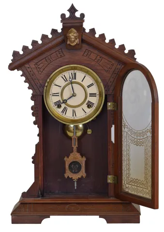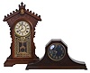 Clocks- 2 (Two): (1) E. N. Welch Clock Co., Forrestville, Conn., "Dolaro" shelf clock with an 8 day spring driven time and strike movement in a black walnut case, c1885. (2) New Haven Clock Co., New Haven, Conn., unidentified tambour clock with an 8 day