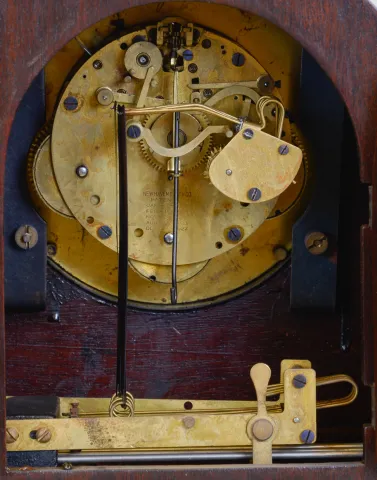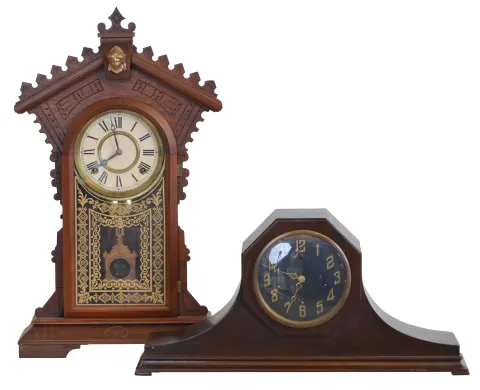 Clocks- 2 (Two): (1) E. N. Welch Clock Co., Forrestville, Conn., "Dolaro" shelf clock with an 8 day spring driven time and strike movement in a black walnut case, c1885. (2) New Haven Clock Co., New Haven, Conn., unidentified tambour clock with an 8 day spring driven time and Westminster strike movement in a mahogany case, c1930. (1) the case has little original finish remaining but is in very good condition. The paper dial is a later replacement. The hands are original. Ht. 23in. (2) The case has its original finish and is in nice condition. The dial and hands are original. The movement is signed. Ht. 10in.