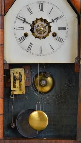 Clocks- 2 (Two): (1) Chauncey Jerome, New Haven, Conn., 30 hour, time and strike spring brass movement Sharp Gothic or Steeple Clock, c. 1850. (2) New Haven Clock Co., New Haven, Conn., 30 hour, time, strike and alarm spring brass movement Sharp Gothic or Steeple clock, c1865 (1) Mahogany veneered case in original finish. Original painted dial is a little soiled at the winding arbors. Original hands and tablet. Stained label inside the case. Ht 20" (2) Mahogany and rosewood veneered case has small damage at the right back edge of the base and at the top door hinge. Original painted dial has a little wear. Original hands and tablet. Dark label inside the case. Ht 20"