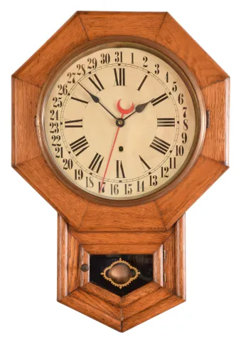 Clocks- 2 (Two): (1) New Haven Clock Co., New Haven, Conn. "Drop Octagon" wall hanging clock with an 8 day spring driven timepiece movement with a simple calendar mechanism in an oak case, c1900. (2) Waterbury Clock Co., Waterbury, Conn., "Drop Octagon"