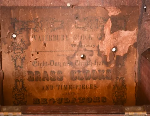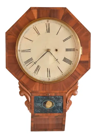 Clocks- 2 (Two): (1) New Haven Clock Co., New Haven, Conn. "Drop Octagon" wall hanging clock with an 8 day spring driven timepiece movement with a simple calendar mechanism in an oak case, c1900. (2) Waterbury Clock Co., Waterbury, Conn., "Drop Octagon" wall hanging clock with an 8 day spring driven timepiece movement in a mahogany and rosewood veneer case, c1874. (1) The oak case has been nicely refinished. The dial and hand appears to be original. The calendar hand may be modern, but proper style, Both glasses are original. The movement is signed. Ht. 24.5in. (2) The case has lost its original finish. The original painted dial is in good condition. The hands are original. The glasses are original. Ht. 24.5in.