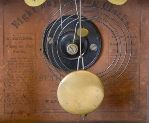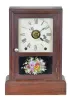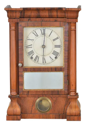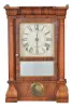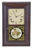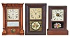 Clocks- 3 (Three): (1) Seth Thomas Clock Co., Thomaston, Conn., "Column" shelf clock with a spring driven 8 day time and strike lyre movement in a rosewood veneered case., c1885. (2) Seth Thomas Clock Co., Thomaston, Conn, "Kitchen" shelf clock with an 8