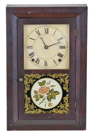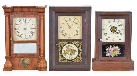 (1) The case has been refinished with minor veneer restoration on the base. The dial has been repainted. The hands are new. Ht. 16in. (2) The original finish is now very age darkened. The dial has been repainted some time ago. The "ST" hands appear period. The door glasses are both original. Ht. 16in. (3) The original finish remains with some veneer loss on the left and right base returns. The original painted dial has some loss. The hands are original. Ht. 14.5in.