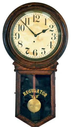 Clocks- 2 (Two): (1) Ingraham Clock Co., Bristol, Conn., "Postal" hanging wall clock with a spring driven 8 day movement in a solid oak case, c1911. (2) Ansonia Clock Co., New York, "Regulator A" wall hanging clock with an 8 day spring driven timepiece movement in an ash case, c1906. (1) The case has original alligatored finish with some issues. The paper dial and hands are in good condition. Ht. 31.3in. (2) The case has been refinished. The paper dial may be original. The hands are a replacement. Ht. 32in.