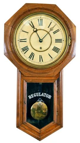 Clocks- 2 (Two): (1) Ingraham Clock Co., Bristol, Conn., "Postal" hanging wall clock with a spring driven 8 day movement in a solid oak case, c1911. (2) Ansonia Clock Co., New York, "Regulator A" wall hanging clock with an 8 day spring driven timepiece