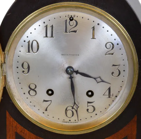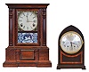 Clocks- 2 (Two): (1) Seth Thomas Clock Co., Thomaston, Conn., 8 day, time and strike spring brass movement beehive mantel clock, c1910 (2) Atkins Clock Co., Bristol, Conn., "London model" 8 day, time and strike spring brass movement shelf clock, c1865 (1) Mahogany case in original finish. Original silvered dial has a little wear to the numbers and some minor scratches. Original hands. Ht 11.25" (2) Refinished rosewood veneered case has some slight damage on the bottom left corner. Original painted dial has some minor loss at the mounting screws. Original hands and tablet. The door knobs are missing. Ht 17"