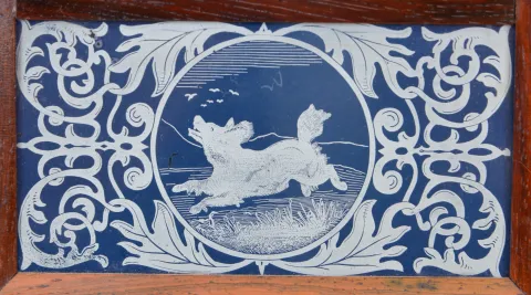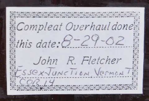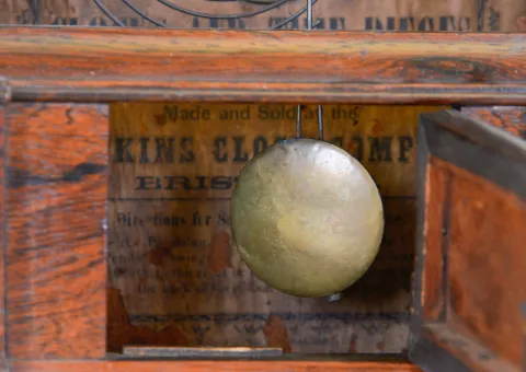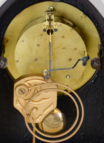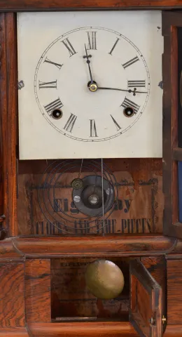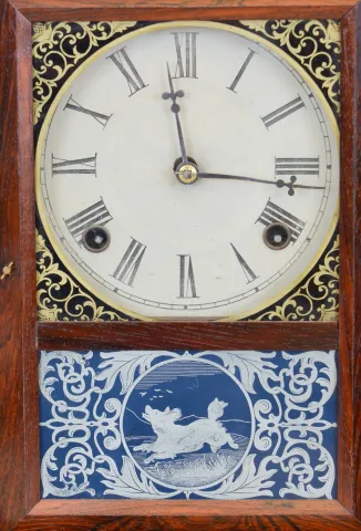 (1) Mahogany case in original finish. Original silvered dial has a little wear to the numbers and some minor scratches. Original hands. Ht 11.25" (2) Refinished rosewood veneered case has some slight damage on the bottom left corner. Original painted dial has some minor loss at the mounting screws. Original hands and tablet. The door knobs are missing. Ht 17"