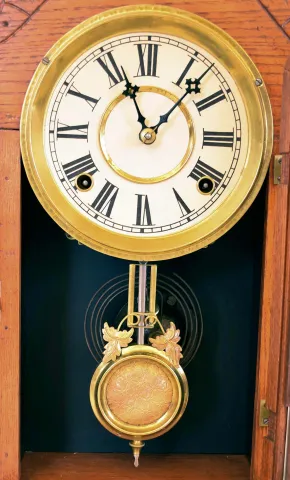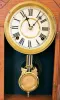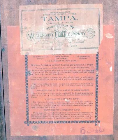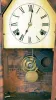 Clocks- 3 (Three): (1) New Haven Clock, New Haven, Conn., 8 day, time and strike spring brass movement Sharp Gothic or Steeple clock, c1875 (2) Waterbury Clock Co., Waterbury, Conn., 8 day, time, strike and alarm spring brass movement shelf clock. (3) William L. Gilbert Clock Co., Winsted, Conn., "Hawk", 8 day, time and strike spring brass movement shelf clock, c1891 (1) Rosewood veneered case in an old finish has loss on the base. Original painted dial has age darkened and has some loss at the mounting screws. Original tablet has some loss. The gong has been changed out. Period hands. (2) Unfinished oak case. Original paper dial is stained with wear to the numbers. Original hands, tablet and pendulum. Thermometer tube is missing. Storm glass is intact. Nice label on back of case. (3) Nicely refinished oak case. Original paper dial has been replaced. Original hands and pendulum..