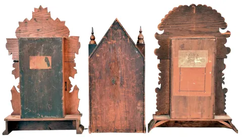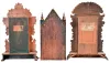 (1) Rosewood veneered case in an old finish has loss on the base. Original painted dial has age darkened and has some loss at the mounting screws. Original tablet has some loss. The gong has been changed out. Period hands. (2) Unfinished oak case. Original paper dial is stained with wear to the numbers. Original hands, tablet and pendulum. Thermometer tube is missing. Storm glass is intact. Nice label on back of case. (3) Nicely refinished oak case. Original paper dial has been replaced. Original hands and pendulum..