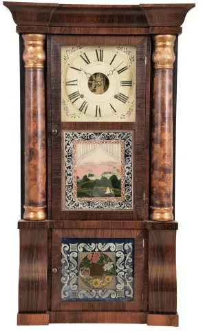 Seth Thomas Clock Co., Plymouth Hollow, Conn., "Column and Cornice" shelf clock with an 8 day weight driven time and strike brass lyre movement in a rosewood case. The case is in excellent condition with nicely preserved tortoise shell columns with gilt caps and bases. The dial was repainted some time ago. The hands are original. The door glasses are all original with the the bottom two still showing vivid colors. The strike gong is missing. The movement is signed. Overall a very nice early example of this model.