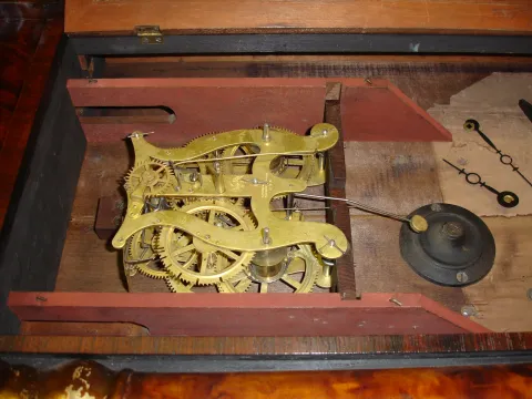 The case is in excellent condition with nicely preserved tortoise shell columns with gilt caps and bases. The dial was repainted some time ago. The hands are original. The door glasses are all original with the the bottom two still showing vivid colors. The strike gong is missing. The movement is signed. Overall a very nice early example of this model.