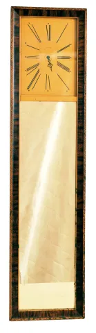 the Waltham has nice matched wood grain and carved molding, the mirror shows some small tarnish spots, a presentation plate was removed from the bottom, and the the minute hand is absent. It sets but does not wind. The gallery clock has a new section of backboard, but otherwise looks original with a signed dial and extensive wear to the gilding. Original hands. Waltham is 47 x 11.5 in; Ingraham total diameter is 16 in. Not tested, sold as is with no further details available