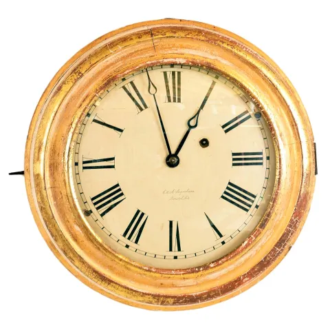 Clocks- 2 (Two) 8 day time only wall clocks: Waltham mirror clock with 37- size twin spring car clock movement, c1925 and an E. & A, Ingraham, Bristol, CT gilt wood gallery clock c1852 the Waltham has nice matched wood grain and carved molding, the mirror shows some small tarnish spots, a presentation plate was removed from the bottom, and the the minute hand is absent. It sets but does not wind. The gallery clock has a new section of backboard, but otherwise looks original with a signed dial and extensive wear to the gilding. Original hands. Waltham is 47 x 11.5 in; Ingraham total diameter is 16 in. Not tested, sold as is with no further details available