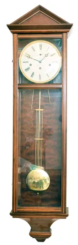 Clocks- 2 (Two) Vienna regulator 8 day wall clocks; unsigned antique oak one weight time only ; Hermle modern quarter- chime (not Westminster) with weight- driven time train, spring- driven strike and chime trains
