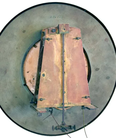 the antique retains an old finish with some dryness splits, the carved lion head is fine, the bottom finial and seconds hand are absent, the white enamel dial has some hairlines, the movement appears complete but dark. The newer Hermle is in a nice case in very good condition, but its brass weight is absent and one of four chime rods is broken. Sold as is, no further details available. Antique is 49 x 13.5 x 6.5 in; Hermle is 45 x 11 x 6 in