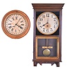 (1) Refinished oak case in clean condition. Paper calendar dial looks original, but is badly stained. The hour and minute look replaced. Period calendar hand. Ht 17" (2) Refinished wood case in nice clean condition. Original paper dial has age darkened a little and is stained at the winding arbor. Original tablet and hands. Original pendulum has a couple small dings. Ht 36"