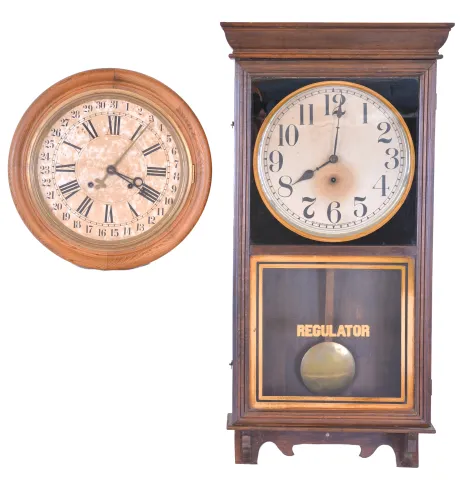 Clocks- 2 (Two): (1) Sessions Clock Co., Forestville, Conn., 8 day, time and strike spring brass movement calendar gallery clock. (2) Sessions Clock Co., Forestville, Conn., "Regulator E", 8 day, spring brass movement wall timepiece. (1) Refinished oak case in clean condition. Paper calendar dial looks original, but is badly stained. The hour and minute look replaced. Period calendar hand. Ht 17" (2) Refinished wood case in nice clean condition. Original paper dial has age darkened a little and is stained at the winding arbor. Original tablet and hands. Original pendulum has a couple small dings. Ht 36"